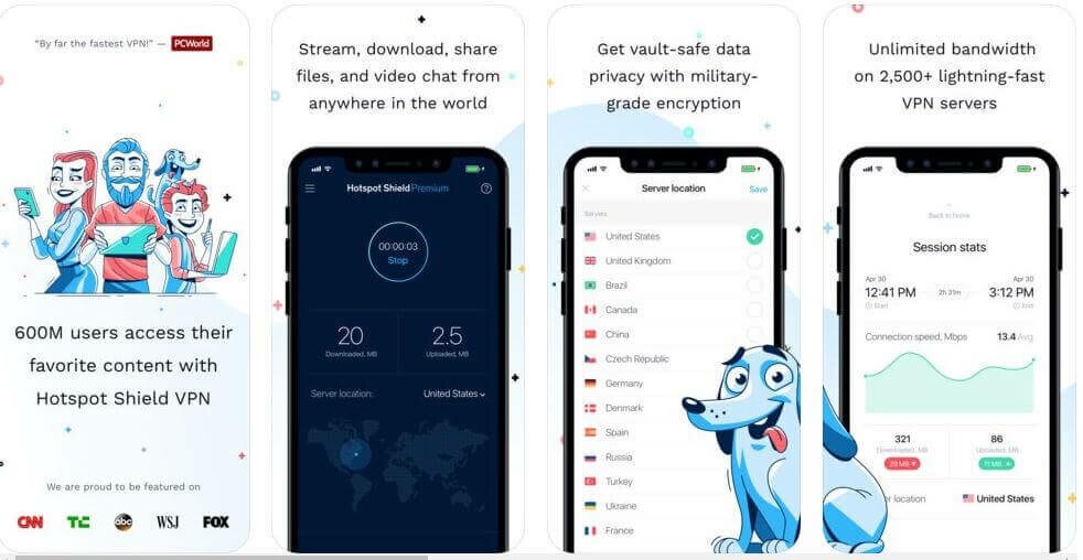 Hotspot Shield VPN Proxy هو تطبيق VPN مجاني آخر لأجهزة iPhone و iPad يشتهر بسرعته وأمانه واستقراره. دعونا نلقي نظرة على ميزات HotSpot Shield: