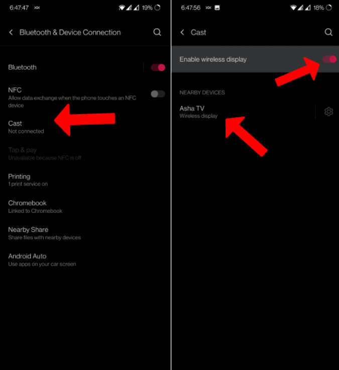 2. الآن على جوال Android ، انتقل إلى الإعدادات> العرض> العرض اللاسلكي وشغل العرض اللاسلكي “Settings > Display > Wireless display” . إذا لم تتمكن من العثور على الخيار في إعدادات العرض ، فافتح الإعدادات> اتصال Bluetooth والجهاز> إرسال وتبديل تمكين العرض اللاسلكي “Settings > Bluetooth & Device Connection > Cast“. سيبدأ البحث عن الخيارات القريبة للإرسال التي تتضمن التلفزيون الخاص بك.