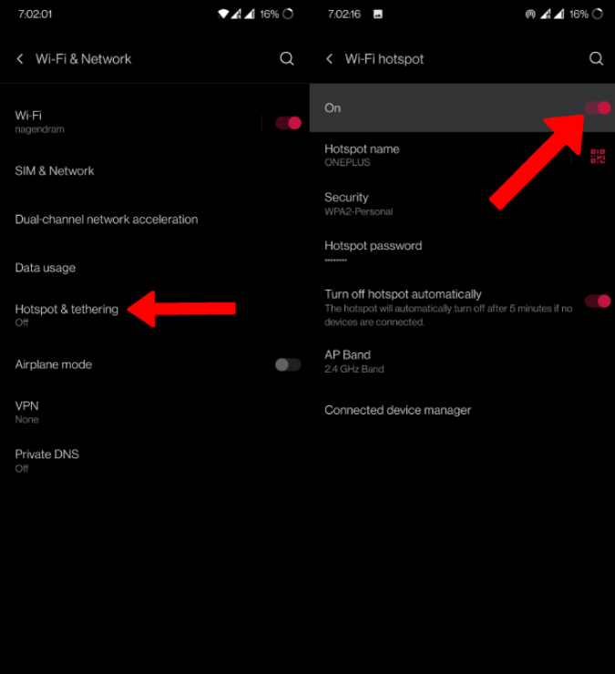 1. في احد الجوالين ، قم بتشغيل نقطة اتصال Wi-Fi. على نظام Android ، افتح Wi-Fi والشبكة> نقطة الاتصال والربط> نقطة اتصال Wi-Fi وقم بتشغيل نقطة اتصال واي فاي “Wi-Fi & Network > Hotspot & tethering > Wi-Fi hotspot“.على iPhone ، انتقل إلى الإعدادات> الهاتف الخلوي> نقطة الاتصال الشخصية وقم بتشغيلها”Settings > Cellular > Personal Hotspot“.